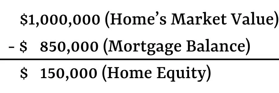 Home equity is the difference between what your home is worth and the amount you owe on your mortgage. So, for example, if your home would currently sell for $250,000, and the remaining balance on your mortgage is $200,000, then you have $50,000 in home equity.