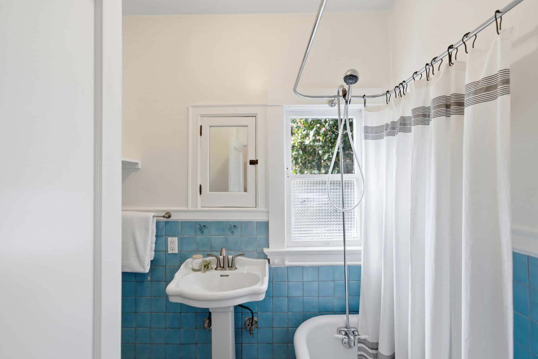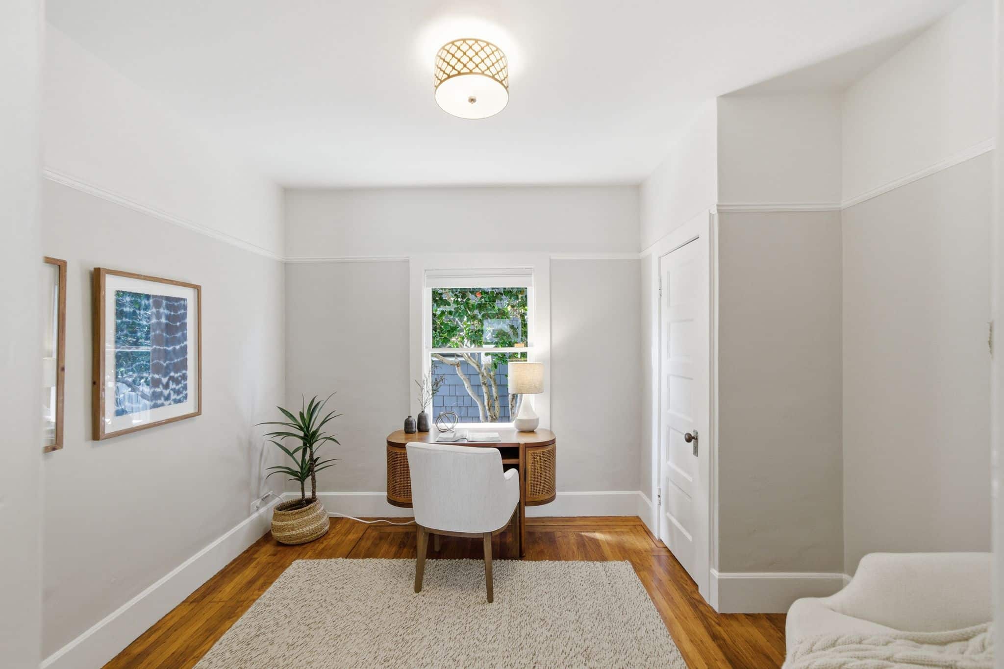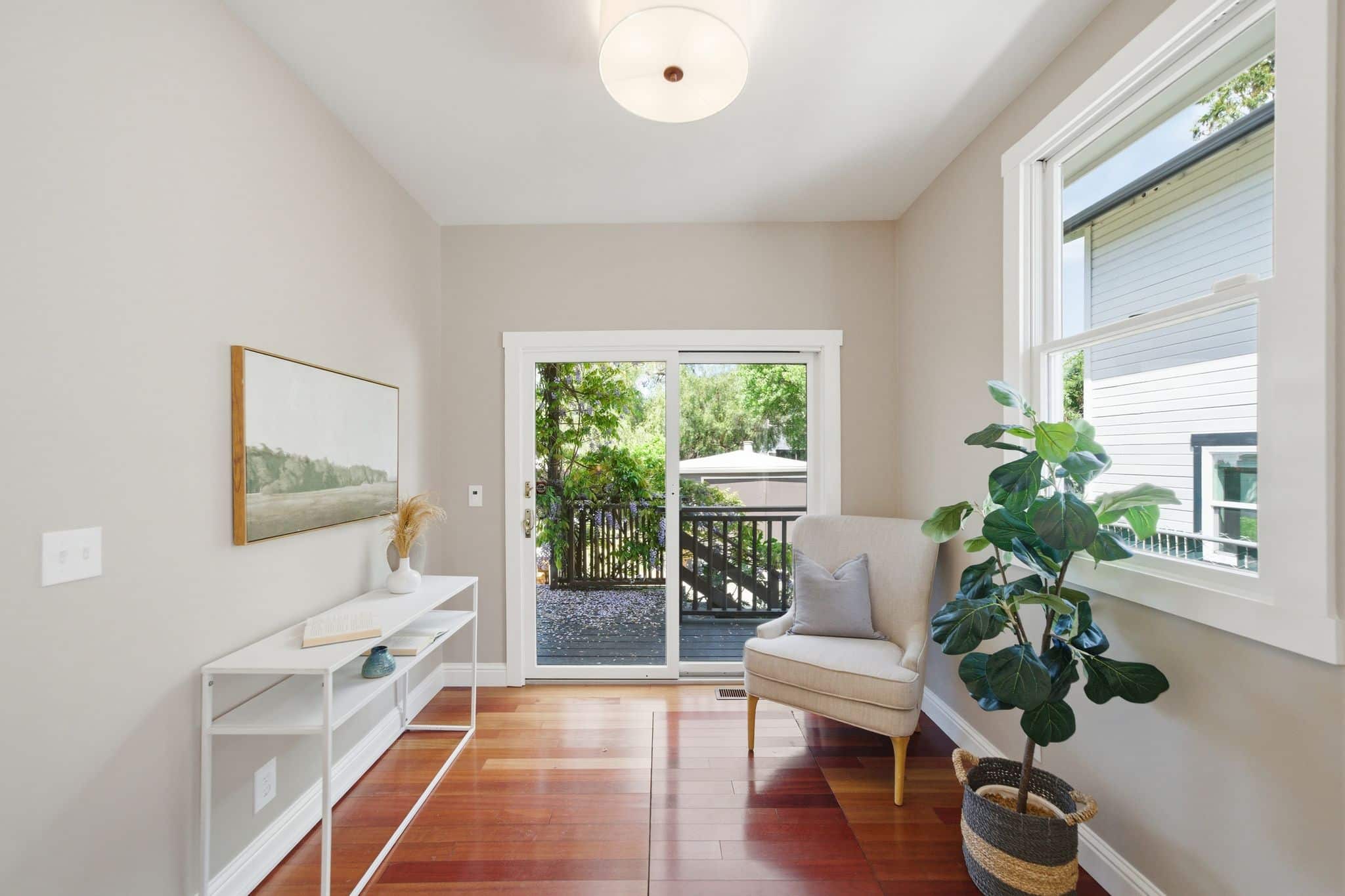 Toward the back of the main floor, the plan opens into a rear wing with two bedrooms, an office that functions equally well as a fourth bedroom or creative space, two full bathrooms, and a dedicated laundry room. The laundry room earns its own mention: it has sliding glass doors that open directly to the back deck, a detail that makes an everyday errand feel considerably more pleasant. The back bathroom was fully renovated with a glass-enclosed walk-in shower, white vanity, and a window looking into the garden.