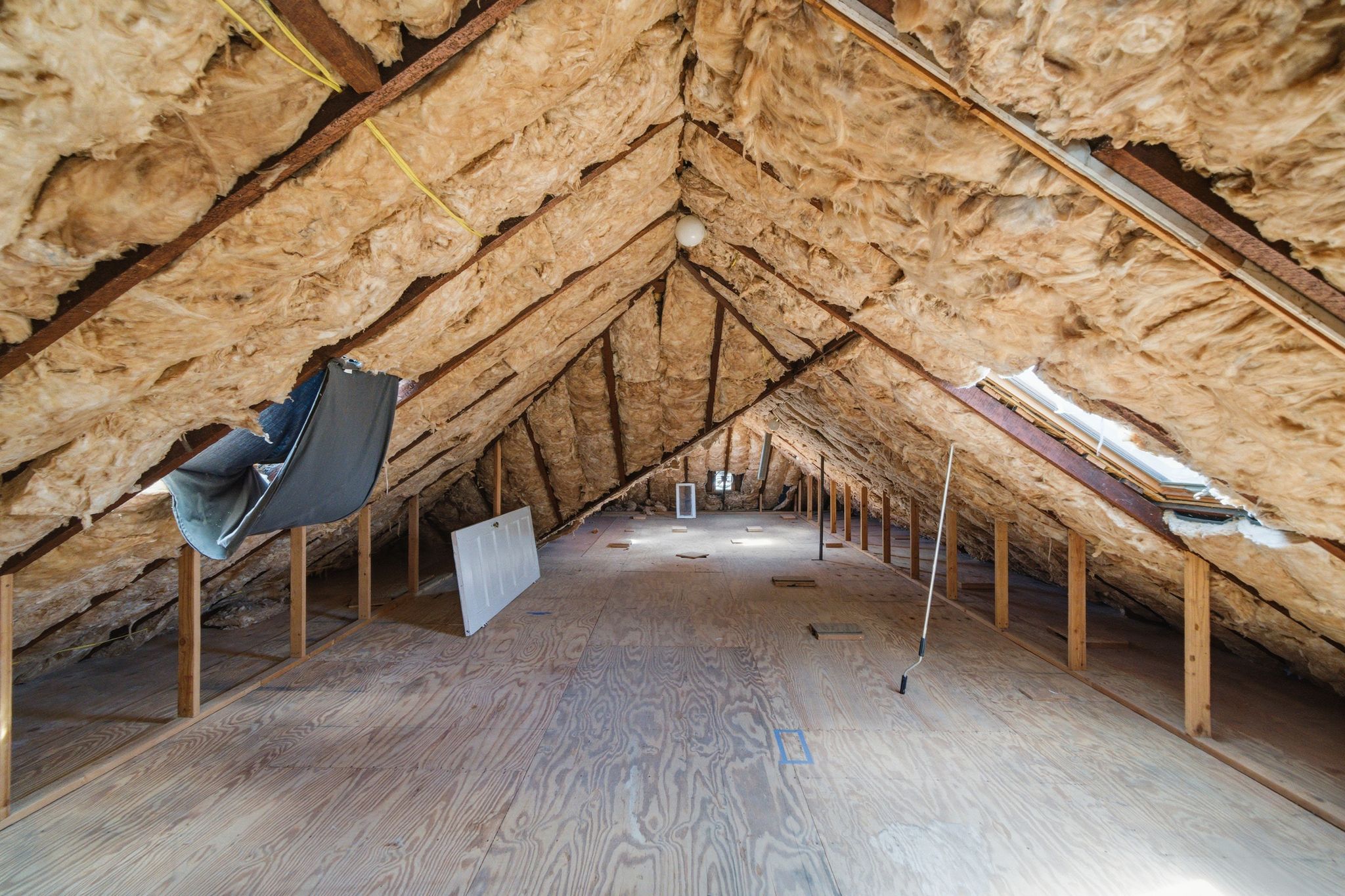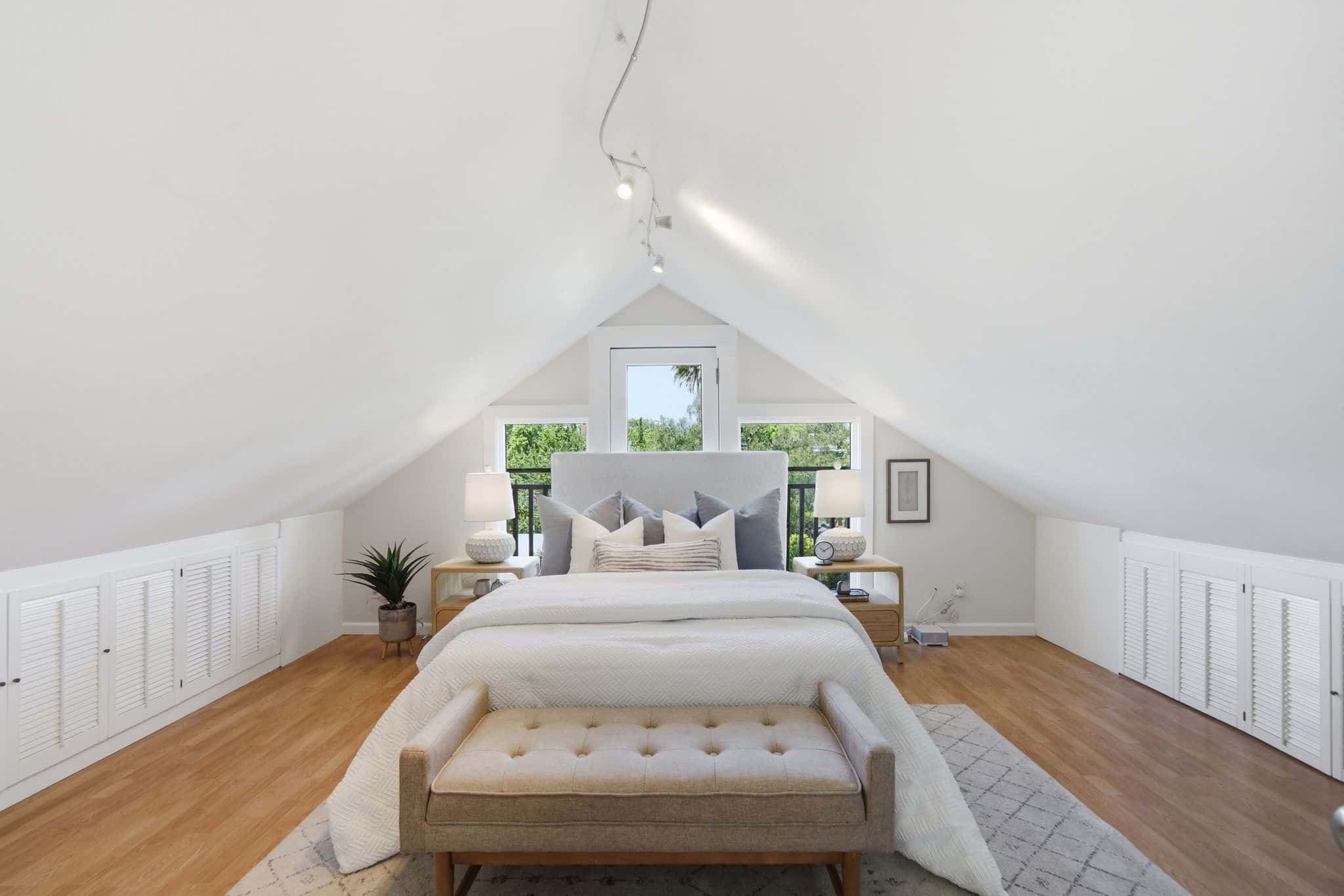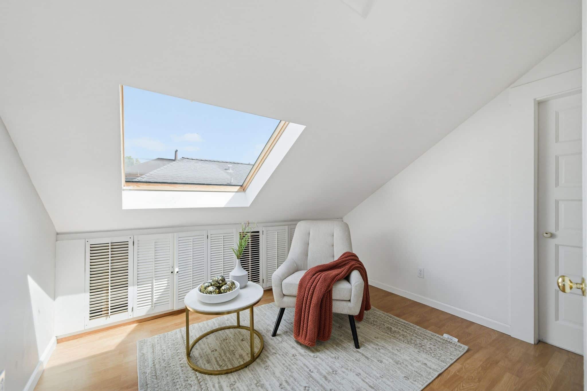 Upstairs, the primary bedroom is genuinely unexpected. The ceiling follows the roofline to a dramatic triangular peak — bright white, airy, and sculptural — with built-in shuttered storage running along the knee walls on both sides and gable windows framing views of the surrounding treetops. Track lighting runs along the ridge. Adjacent, a sitting room with its own skylight overhead serves as a reading room, dressing area, or quiet morning retreat. And beyond that, a raw, insulated attic nearly 44 feet long runs the full width of the house — fully floored, lit by skylights, and ready for a buyer who wants to imagine what comes next.