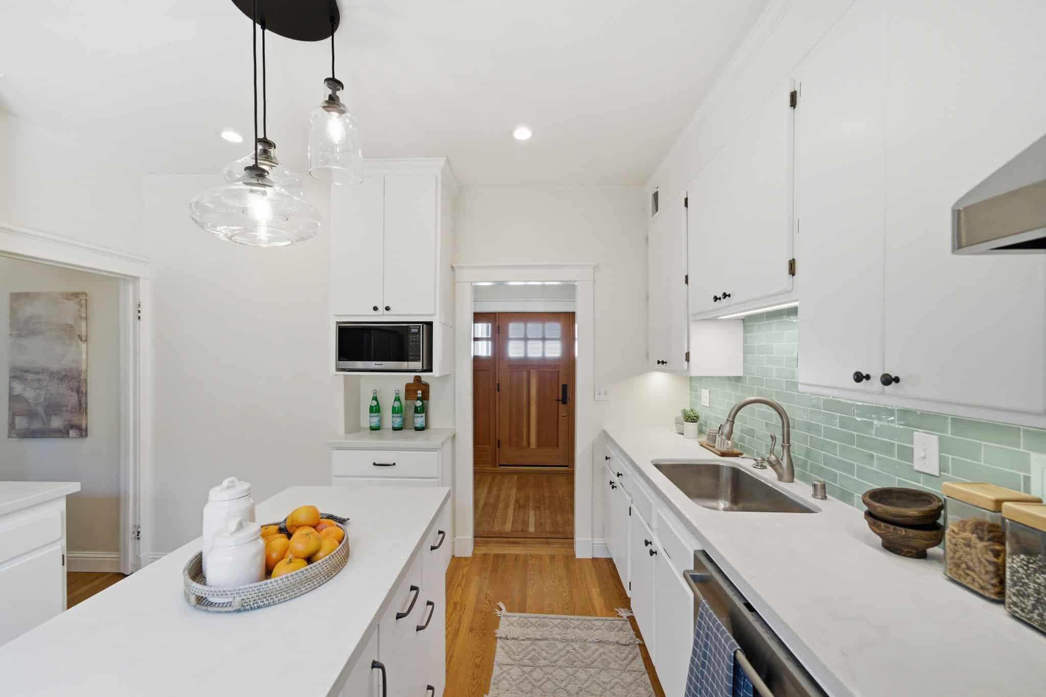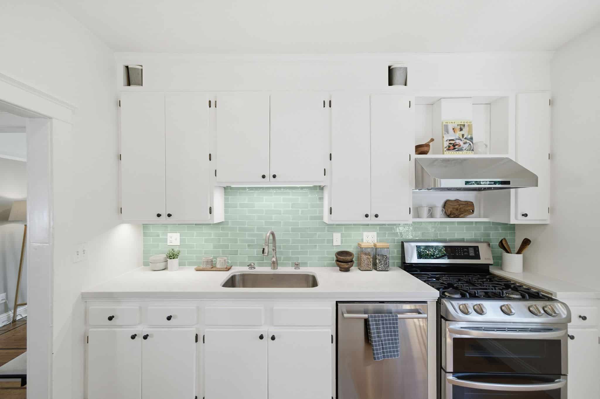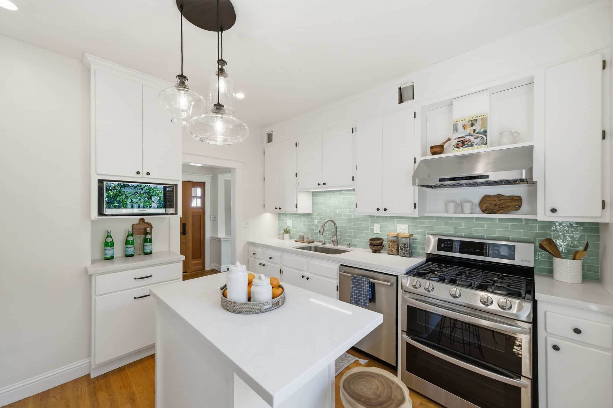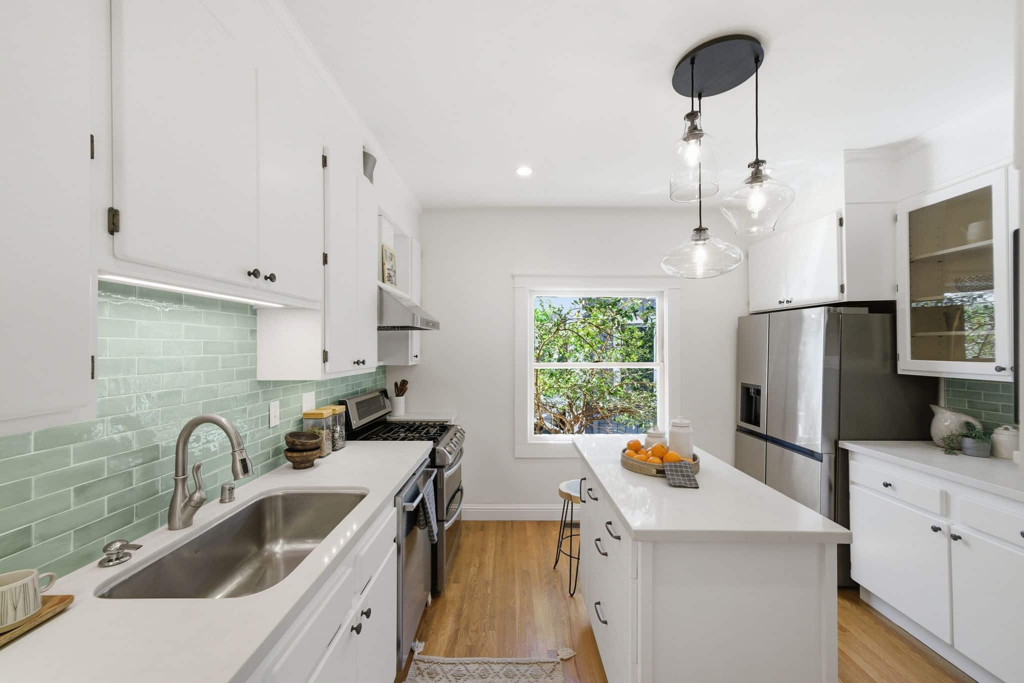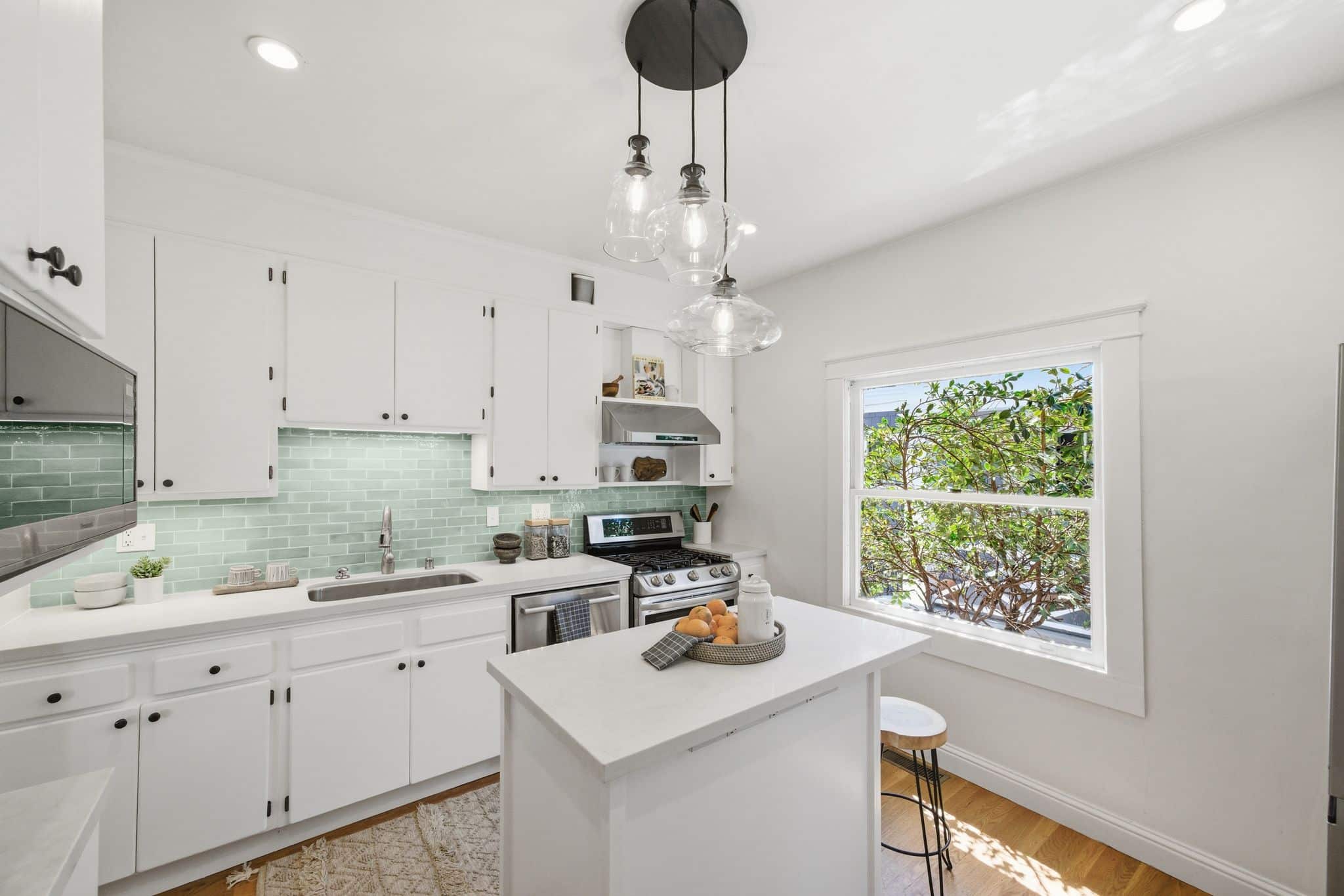 The kitchen is fresh and functional. White cabinets with black hardware, white quartz countertops, a moss green subway tile backsplash, a cluster of three glass pendant lights over the peninsula, and a gas range below the range hood. A window above the sink looks out to the garden. The space is not large but it is well-considered, and the 2026 updates make it feel genuinely new.