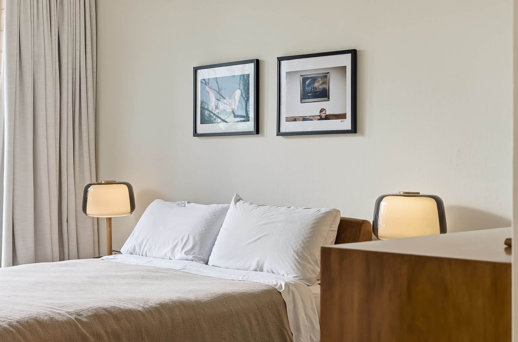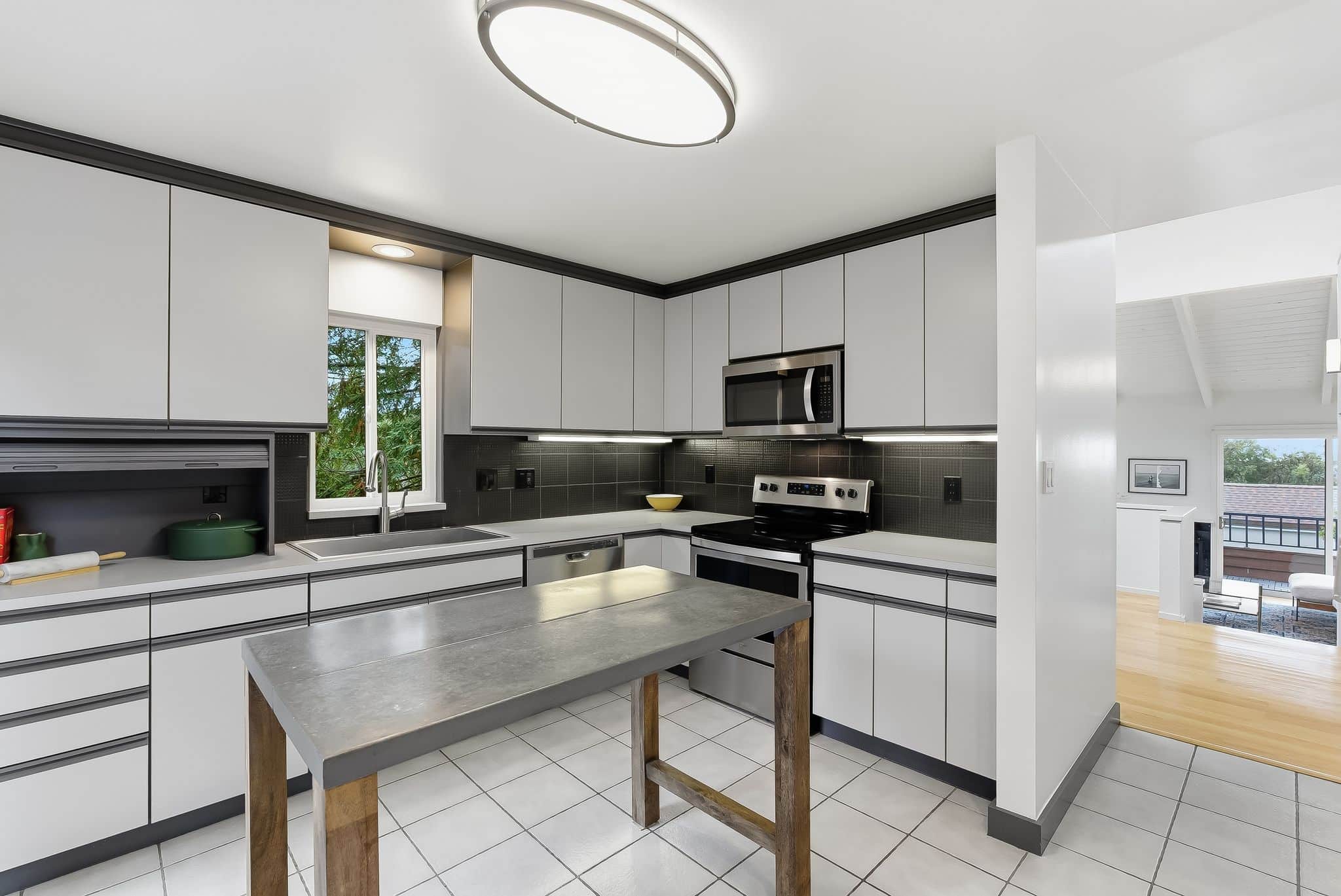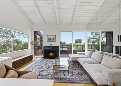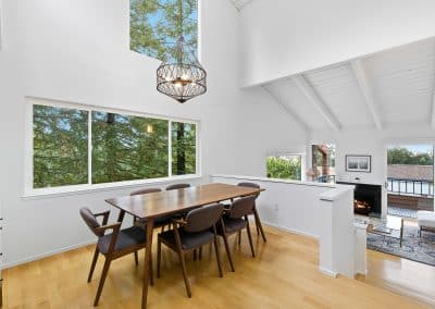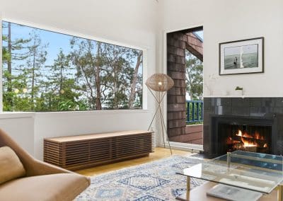 Stepping inside, light floods the interior through expansive windows that frame an ever-changing panorama of the Bay, San Francisco, and Mount Tamalpais. The living room’s wood-burning fireplace anchors the space—perfect for curling up on winter evenings as fog rolls in over the city skyline. Every room offers its own unique view: lush evergreens to the rear, golden sunsets to the west, and sweeping Bay vistas from nearly every angle.