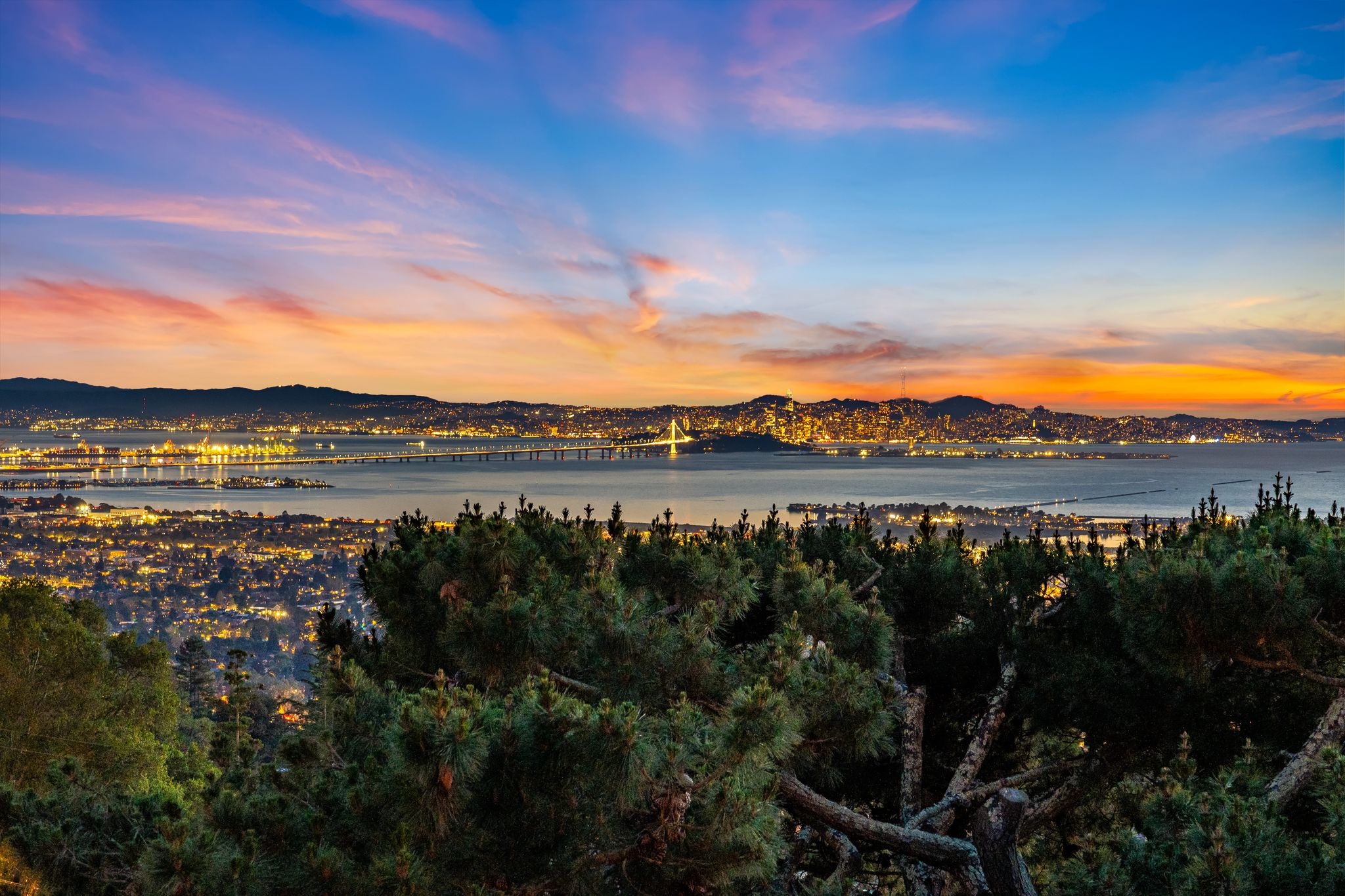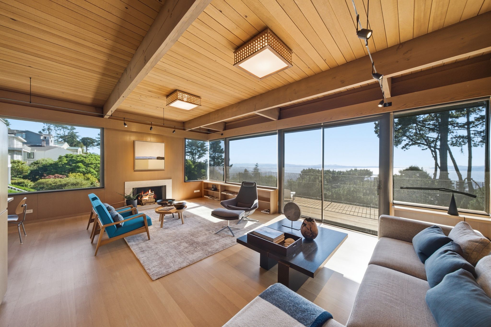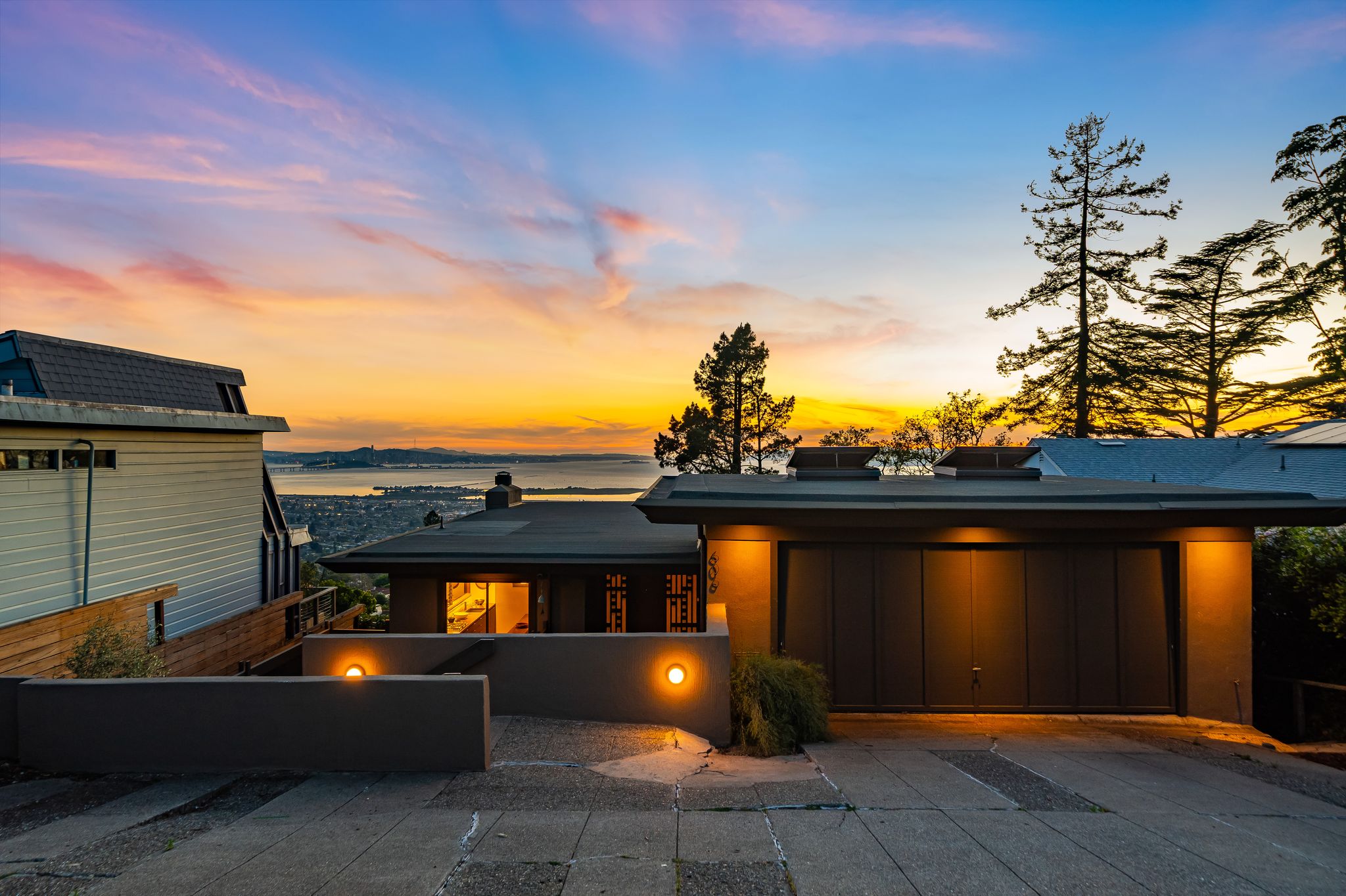 Architect-designed 1968 mid-century modern | John Rolf Hattam architect | Panoramic Bay views| 3 bedrooms + 2 baths main level | Open plan living and dining | Original wood-paneled walls | Museum-quality white oak floors | 8-foot doors | Updated kitchen | Polished concrete countertops | Floating Island | Custom Heath tile | Private Japanese garden courtyard | Cantilevered deck with bronze railing | Lower level family room and study | Lower level guest bedroom | Lower level full bath | Storage pre-plumbed for future kitchen | Lower level garden deck | Converted 2-car garage artist’s studio | Professional skylights | Art lighting throughout | Pre-wired for serious creative work | Mid-century furniture collection | Drought-tolerant landscaping