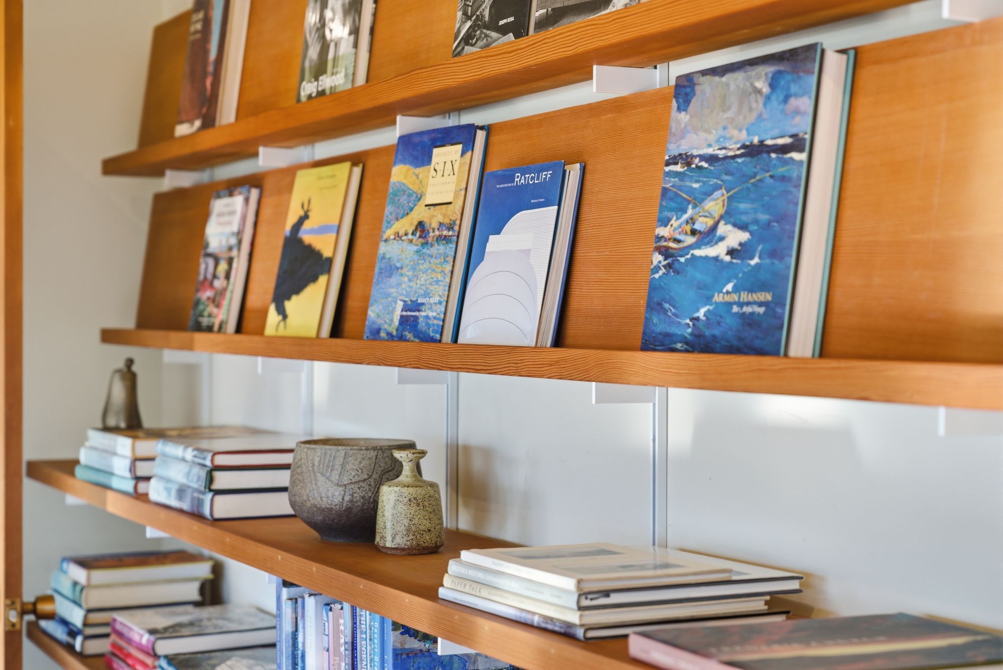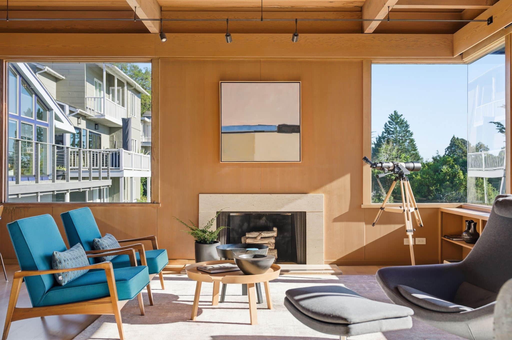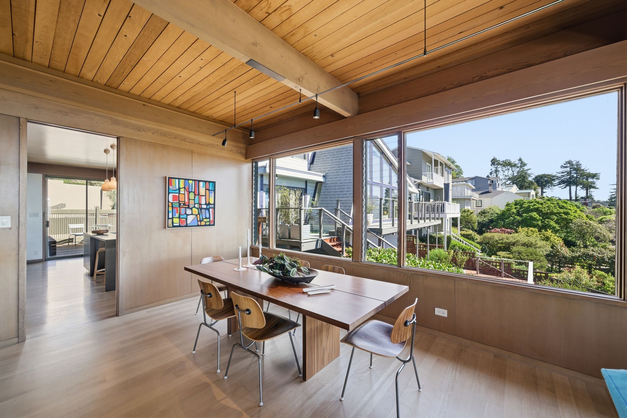 Her celebrated 2020 series “Sky” was painted directly from the living room and deck: the San Francisco skyline, the Golden Gate, Mt. Tamalpais, the light shifting across the Bay through every season. The house didn’t just inspire the work. It is in the work. Much of the mid-century furniture was sourced by Richard, giving the collection a curatorial coherence that is rare outside of museum walls. To move through this home is to understand how great architecture and great art elevate each other.