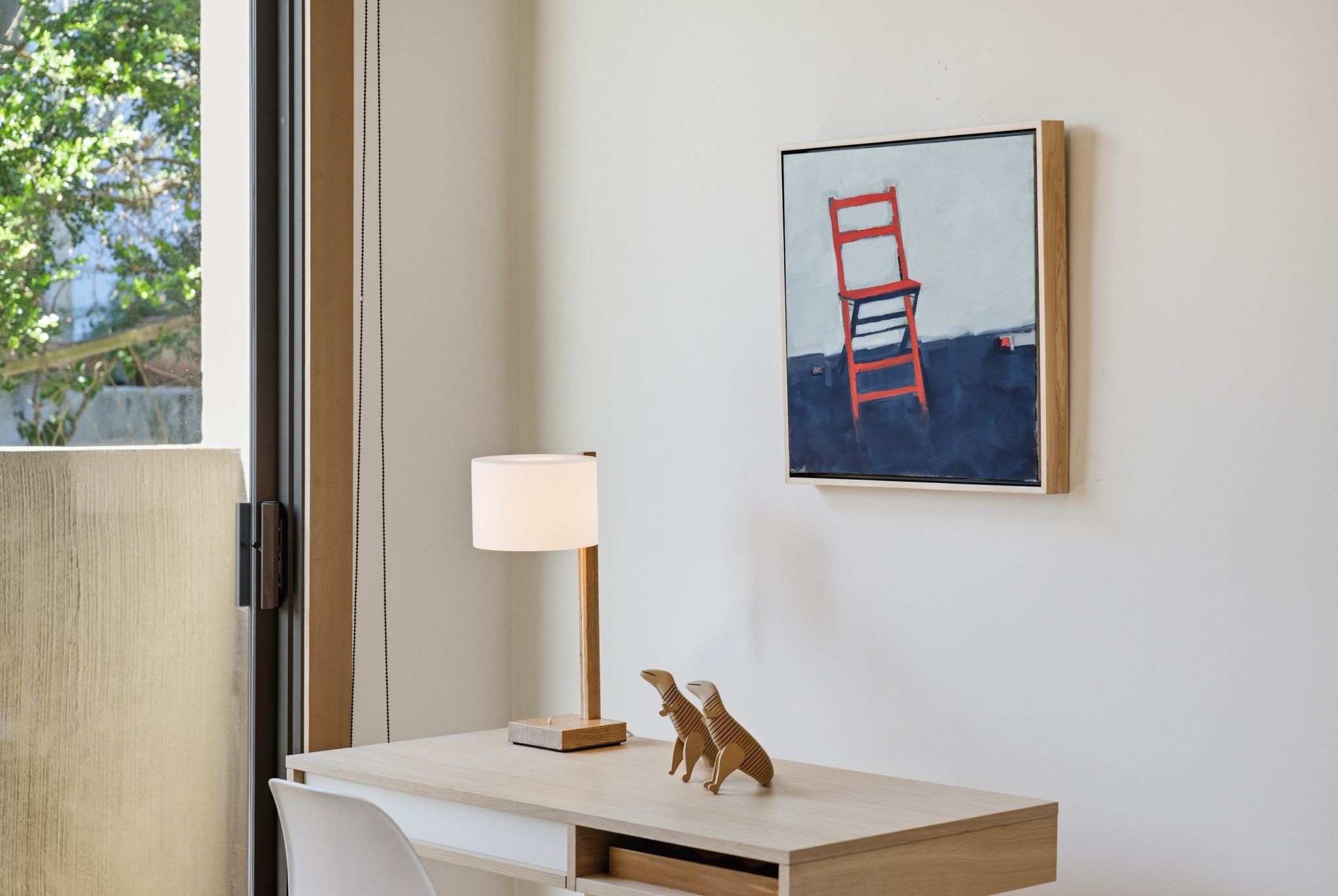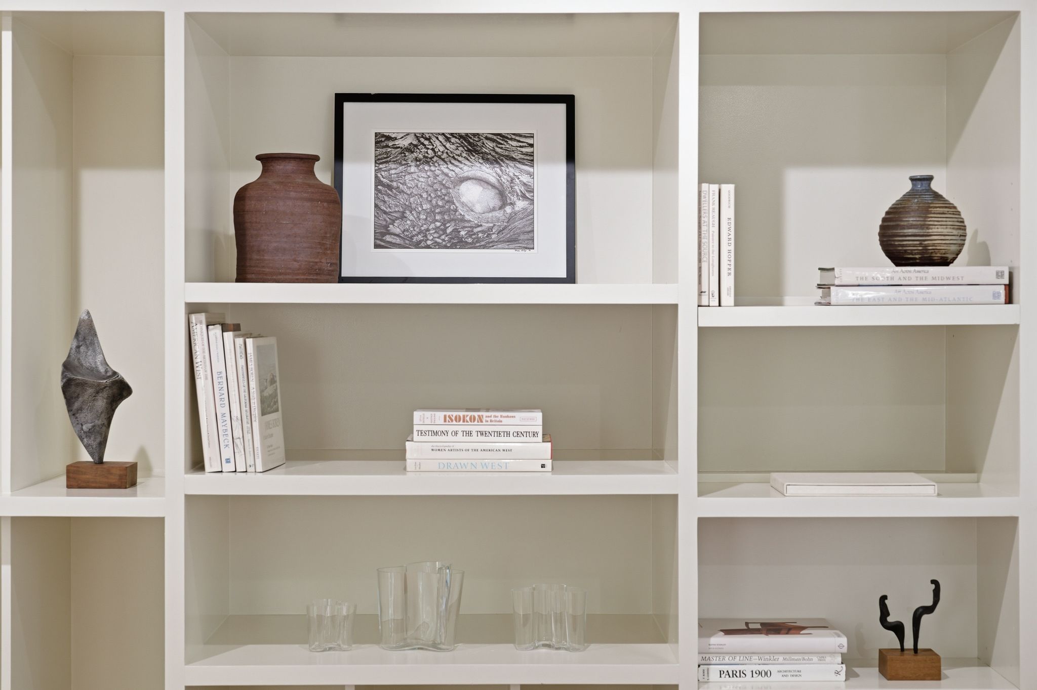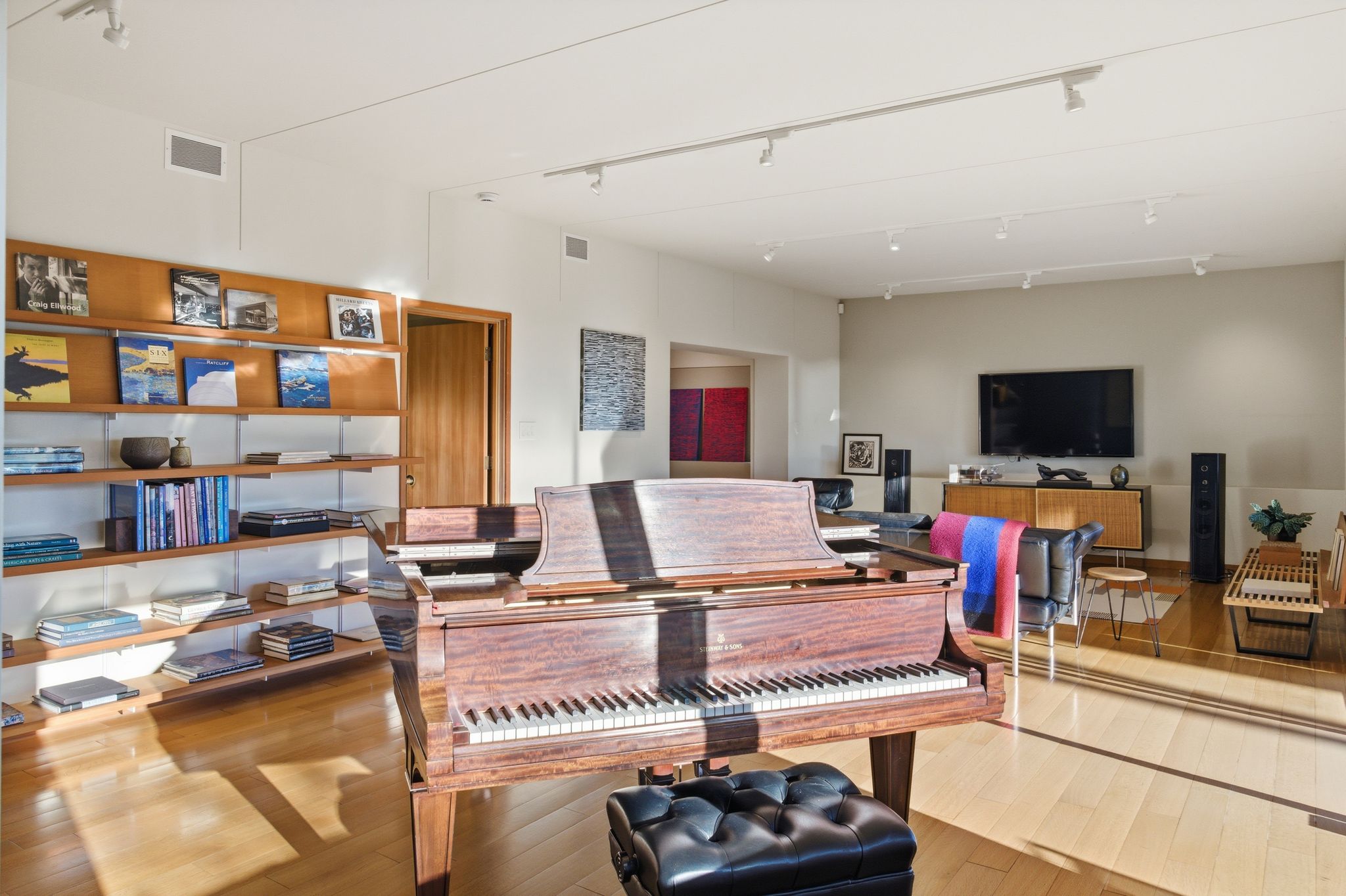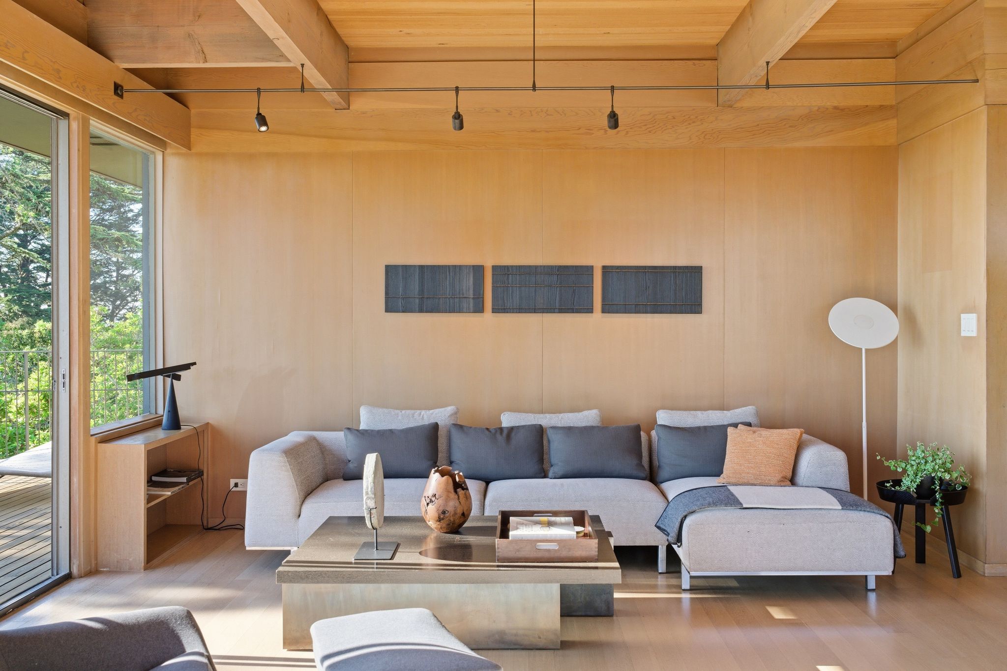 Her celebrated 2020 series “Sky” was painted directly from the living room and deck: the San Francisco skyline, the Golden Gate, Mt. Tamalpais, the light shifting across the Bay through every season. The house didn’t just inspire the work. It is in the work. Much of the mid-century furniture was sourced by Richard, giving the collection a curatorial coherence that is rare outside of museum walls. To move through this home is to understand how great architecture and great art elevate each other.