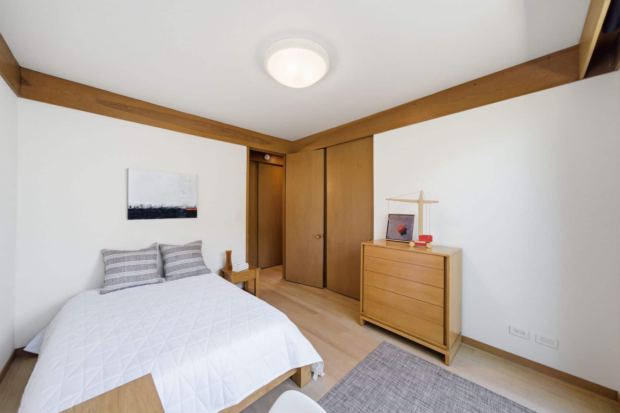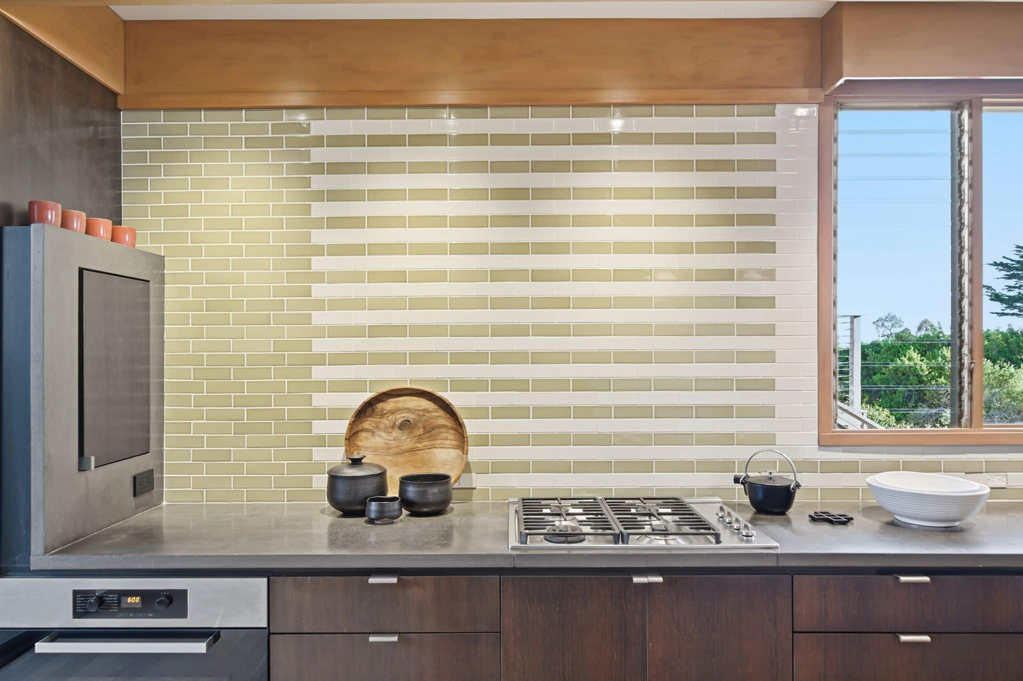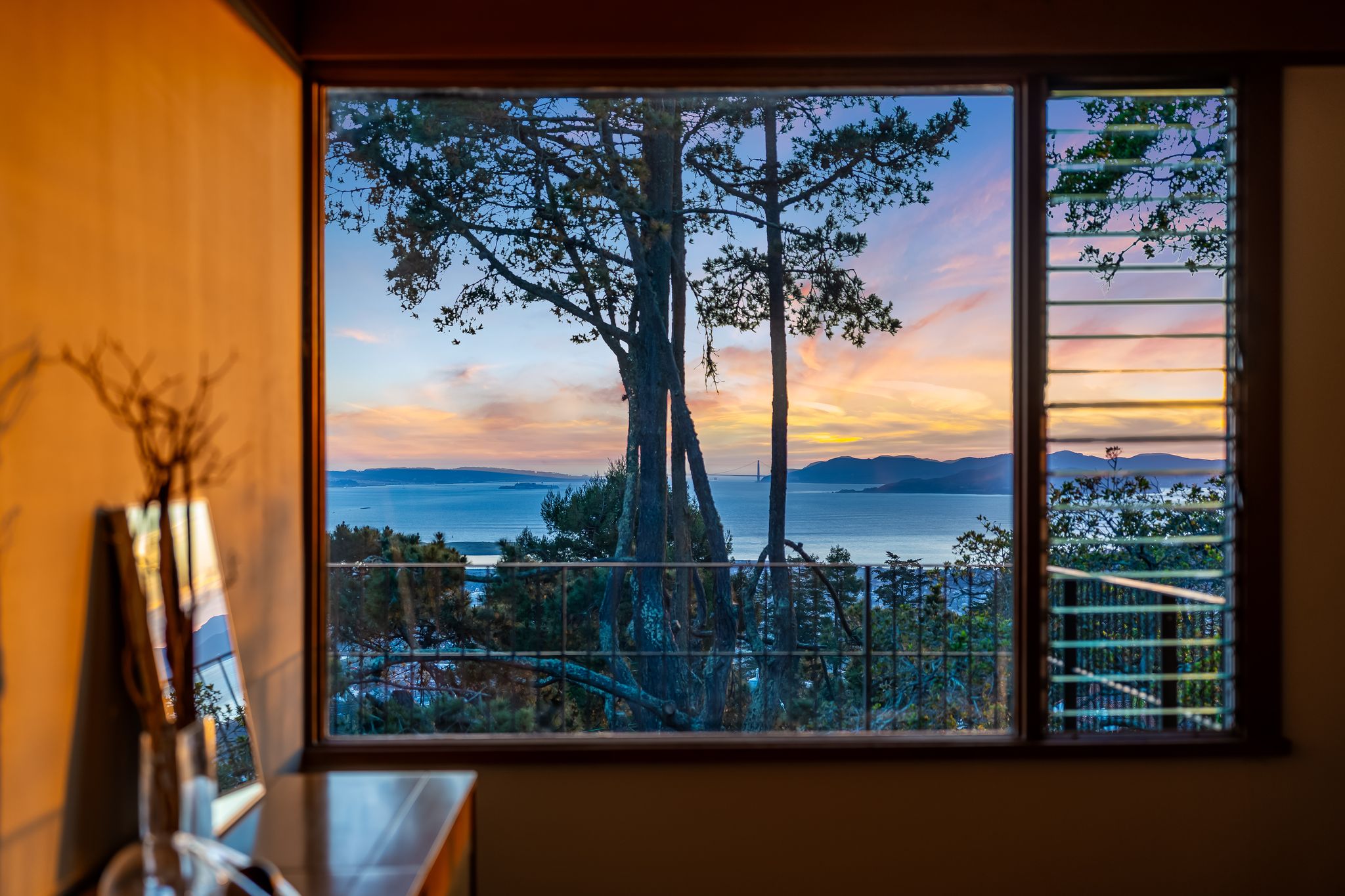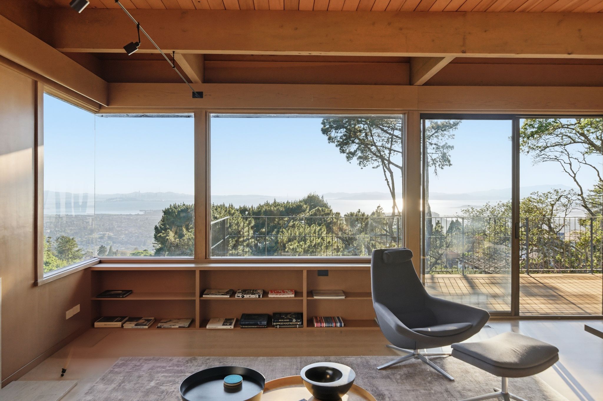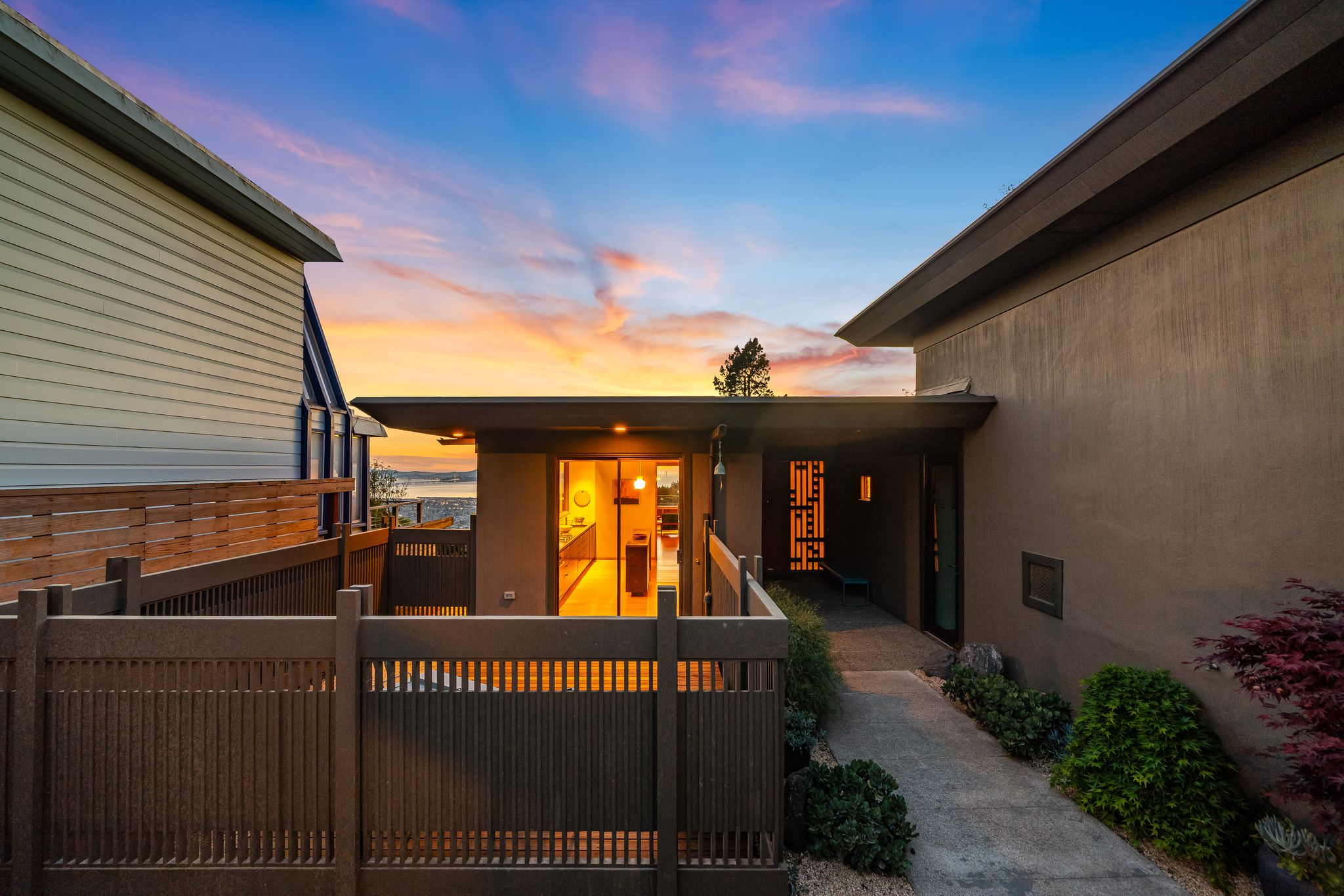 Inside, the main living level delivers on that promise. Three bedrooms and two baths are organized around an open living and dining room with views that stop people mid-sentence. Hattam pushed the western facade toward the Bay, offsetting it from the neighboring homes on either side, and the result is sightlines that open not just to the west but to the north and south as well: a panorama stretching from Marin across San Francisco and down the Peninsula, with the Golden Gate Bridge front and center. Original pecan-toned wood paneled walls and cabinetry have been preserved, complemented by museum-quality matte white oak floors. Soaring ceilings and eight-foot doors do what the best mid-century interiors always do: they make the space feel even larger than it is, so the views have room to breathe. Remote-controlled custom lighting and shades throughout the living and dining rooms let you set the mood without leaving the sofa. The kitchen was updated with custom cabinetry, a central island, polished concrete counters, an indirectly lit Heath tile wall, and a full suite of Miele appliances. Step outside and you’re in a private Japanese garden courtyard, equally good for morning coffee or an intimate dinner party. A rebuilt cantilevered deck off the living room extends the entertaining footprint further, with a custom conforming railing designed to keep sightlines completely unobstructed, even at night.