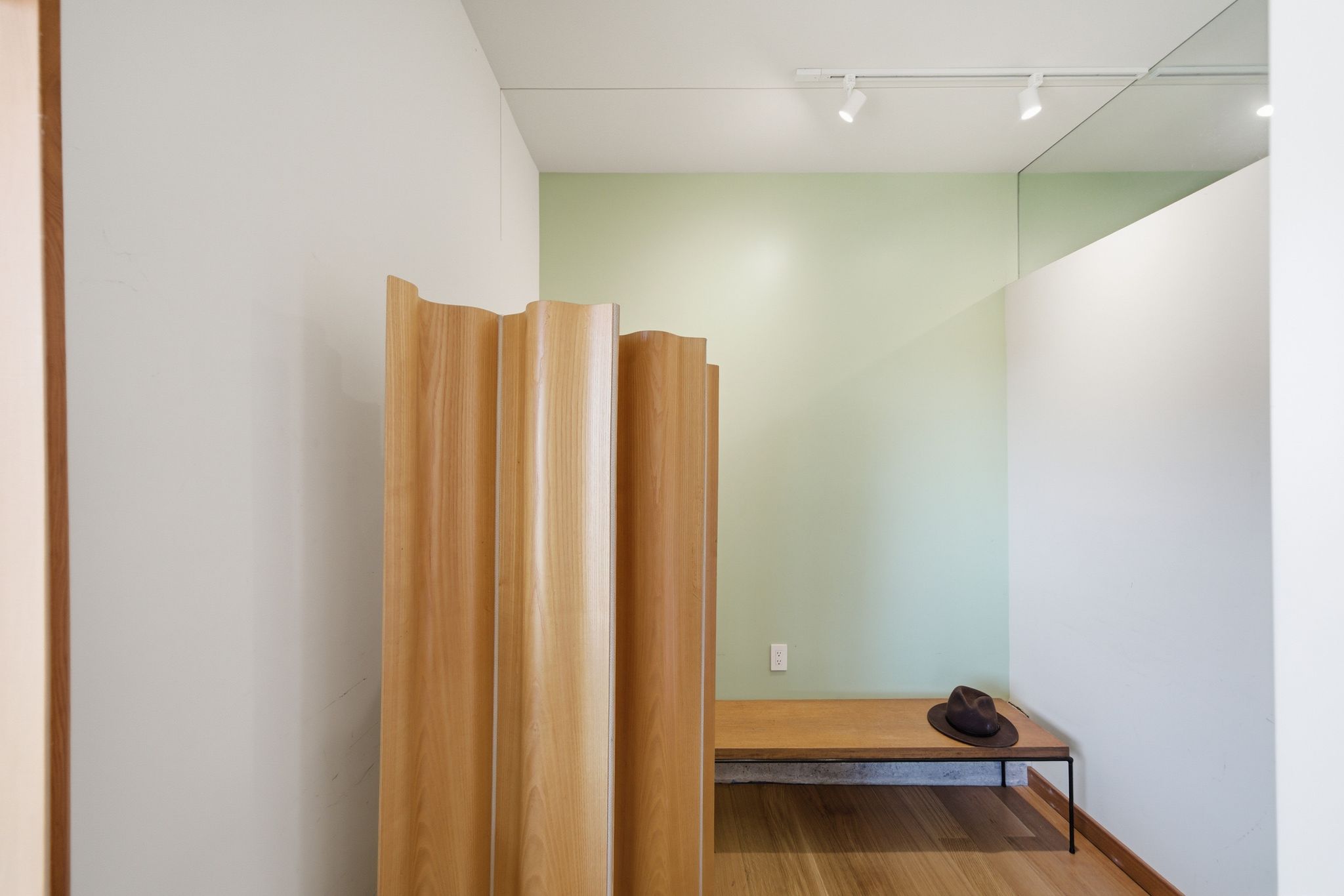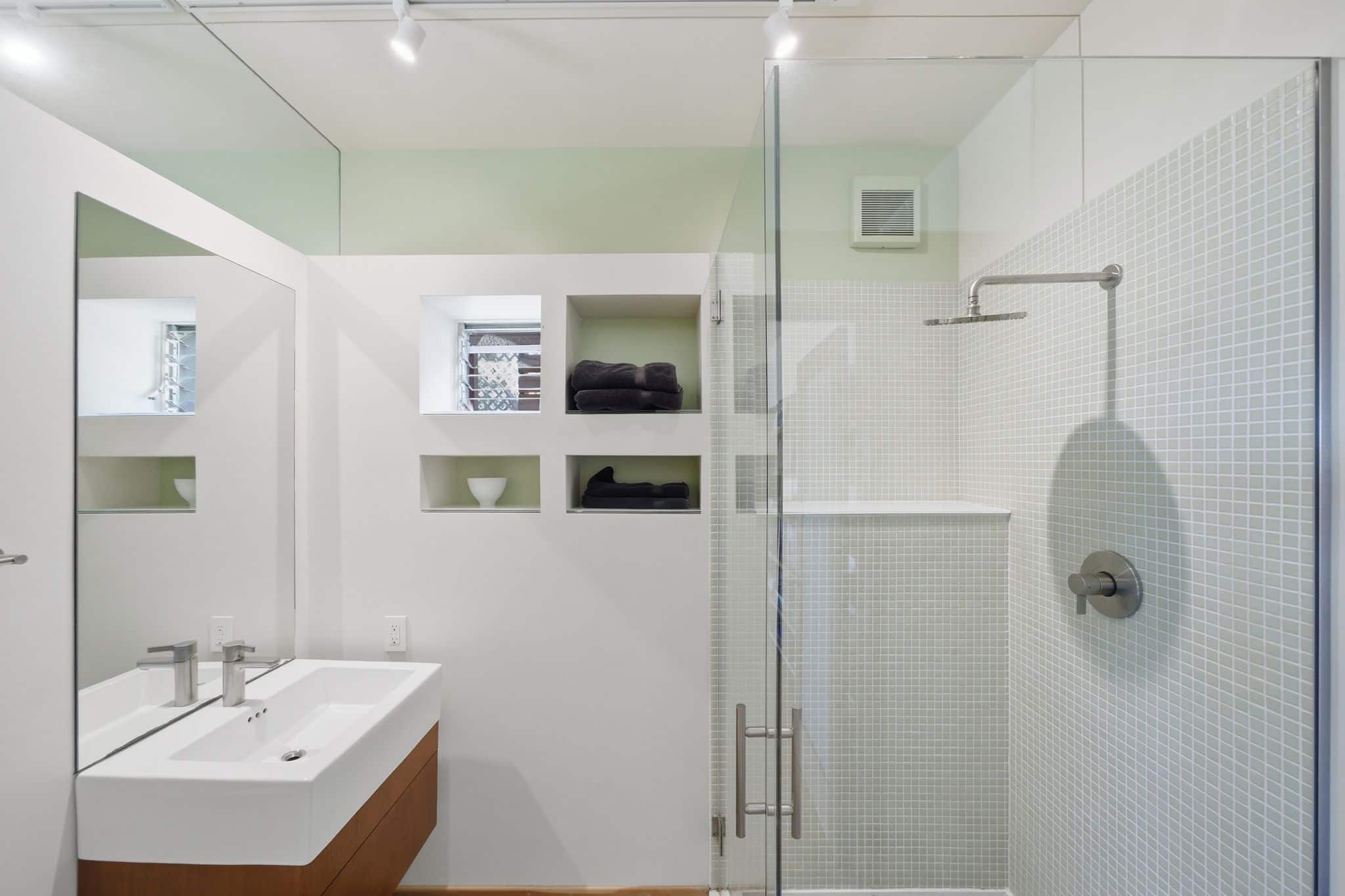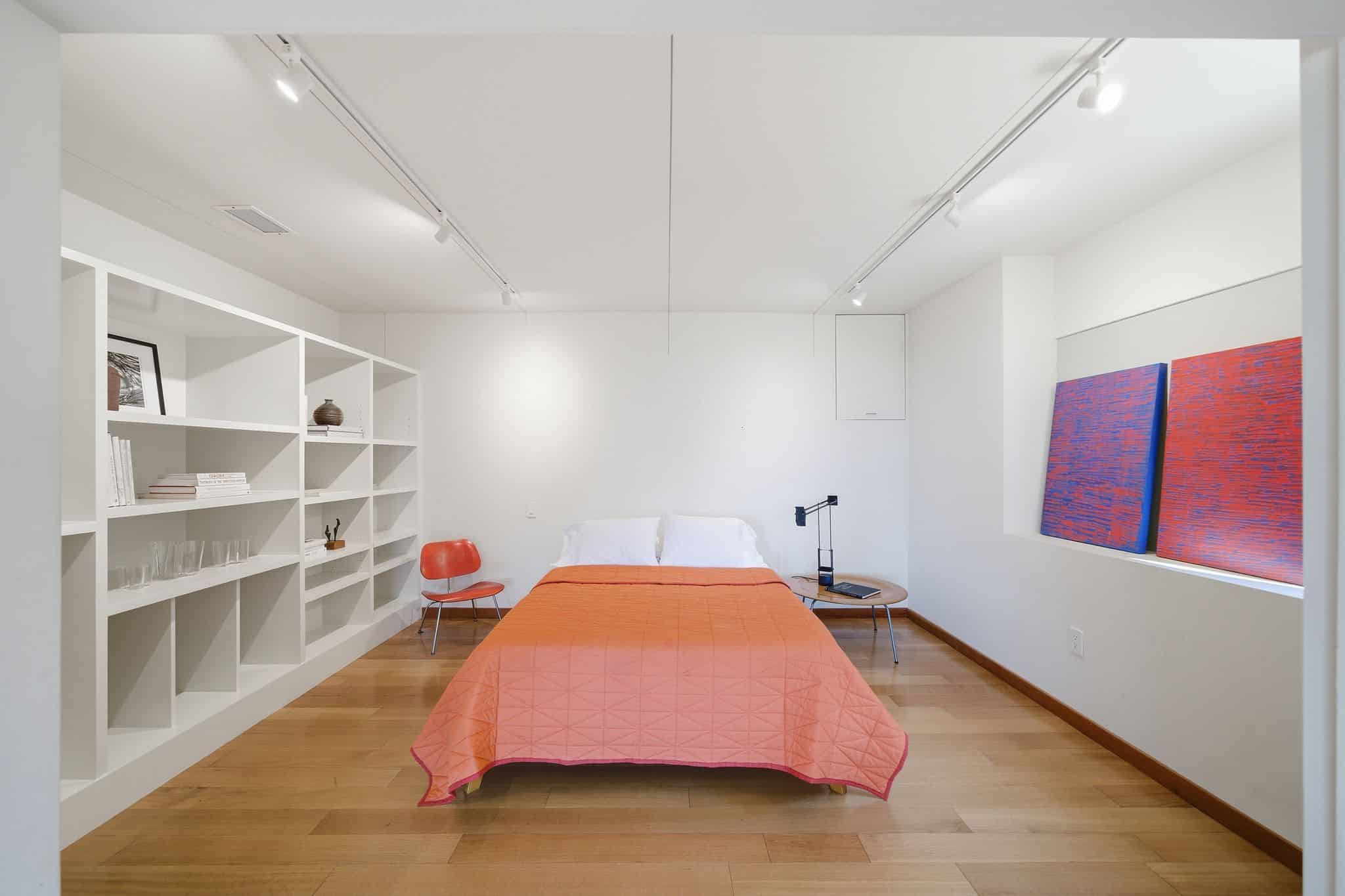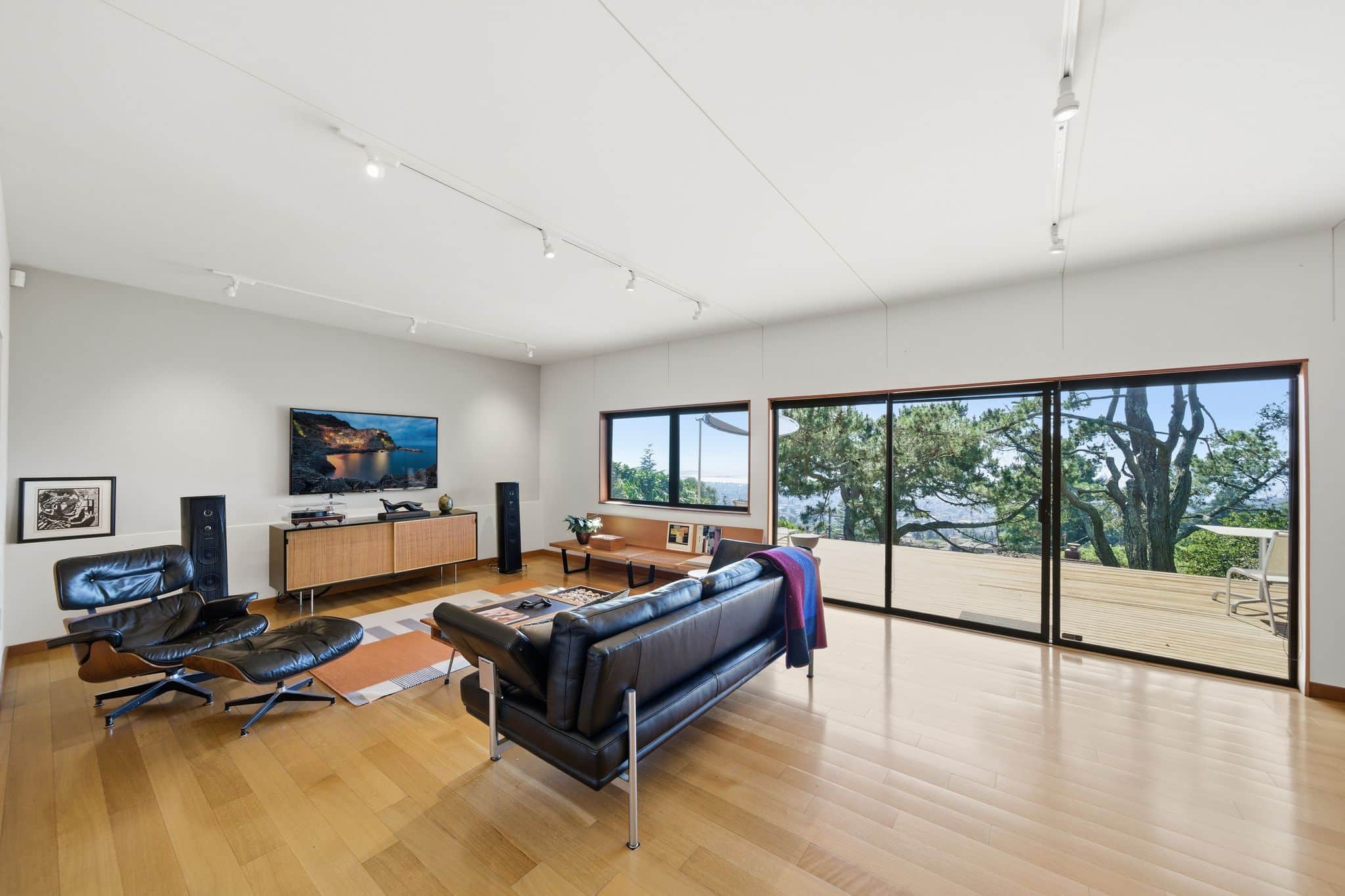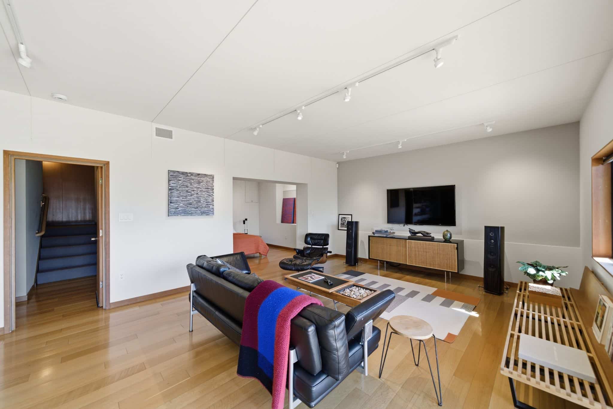 The lower level was transformed from an unfinished shell into a spacious family room and study, a generous guest bedroom, and a beautifully finished full bath with Hans Grohe fixtures, a Schicker shower door, and a concrete shower pan. The owners excavated beneath the house to add an additional 200 square feet, and installed custom awning windows on the western wall to bring the view in. A private garden deck gives the lower floor its own indoor-outdoor connection, and a storage area has been plumbed and wired for a future kitchen. Custom ceiling soundproofing throughout makes this level as serene as it is versatile. The two-car garage was converted into a professional painting studio with skylights, art lighting, and a custom exterior door purpose-built for serious creative work. The full renovation was designed by Rick Irving, formerly Director of Interior Architecture at Richard Meier and Partners and lead designer on the Getty Center interiors.