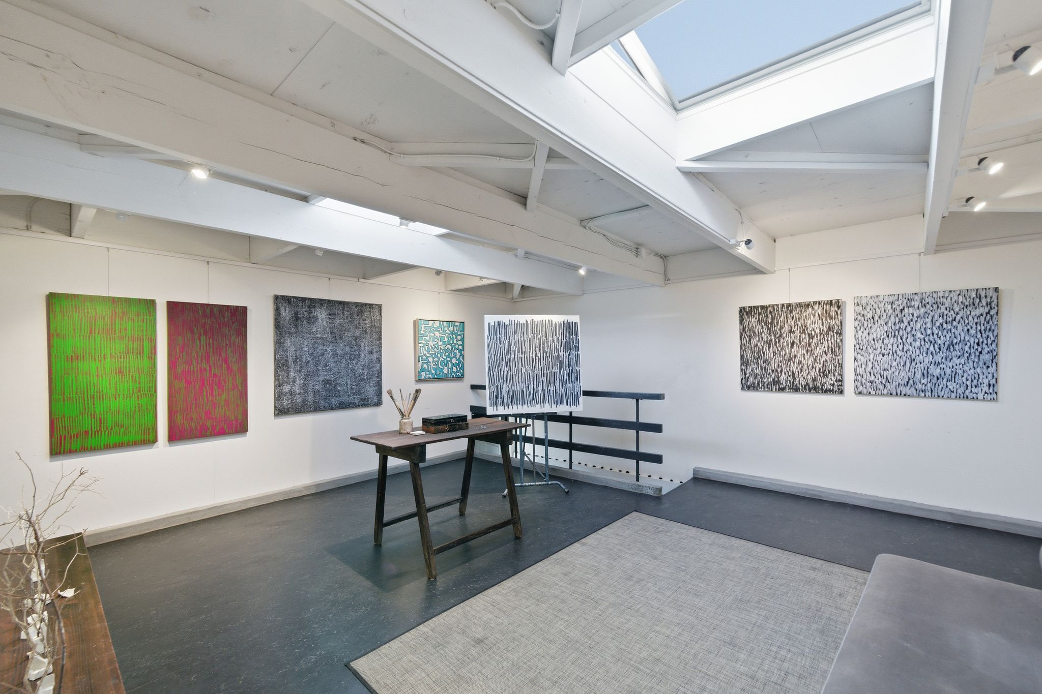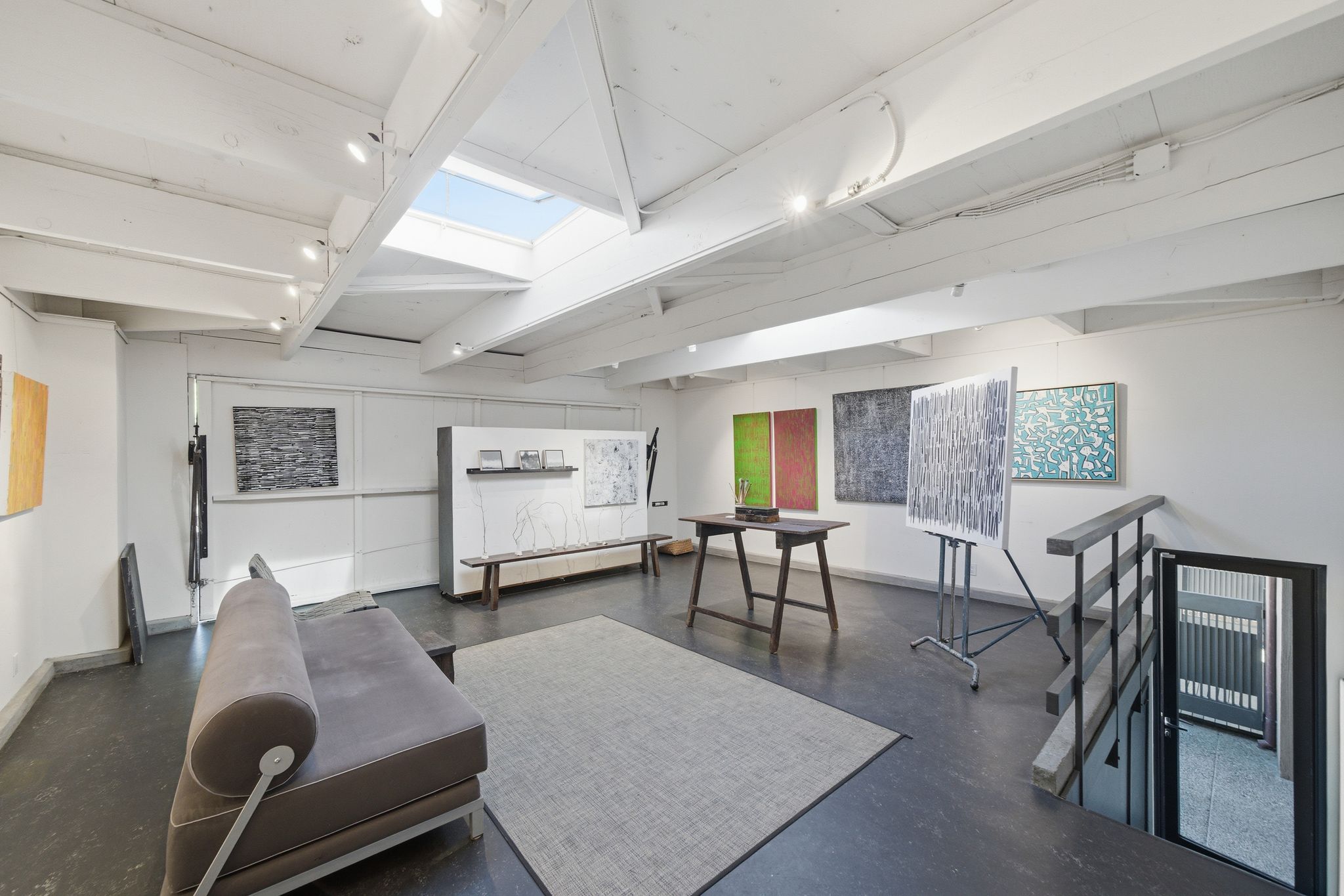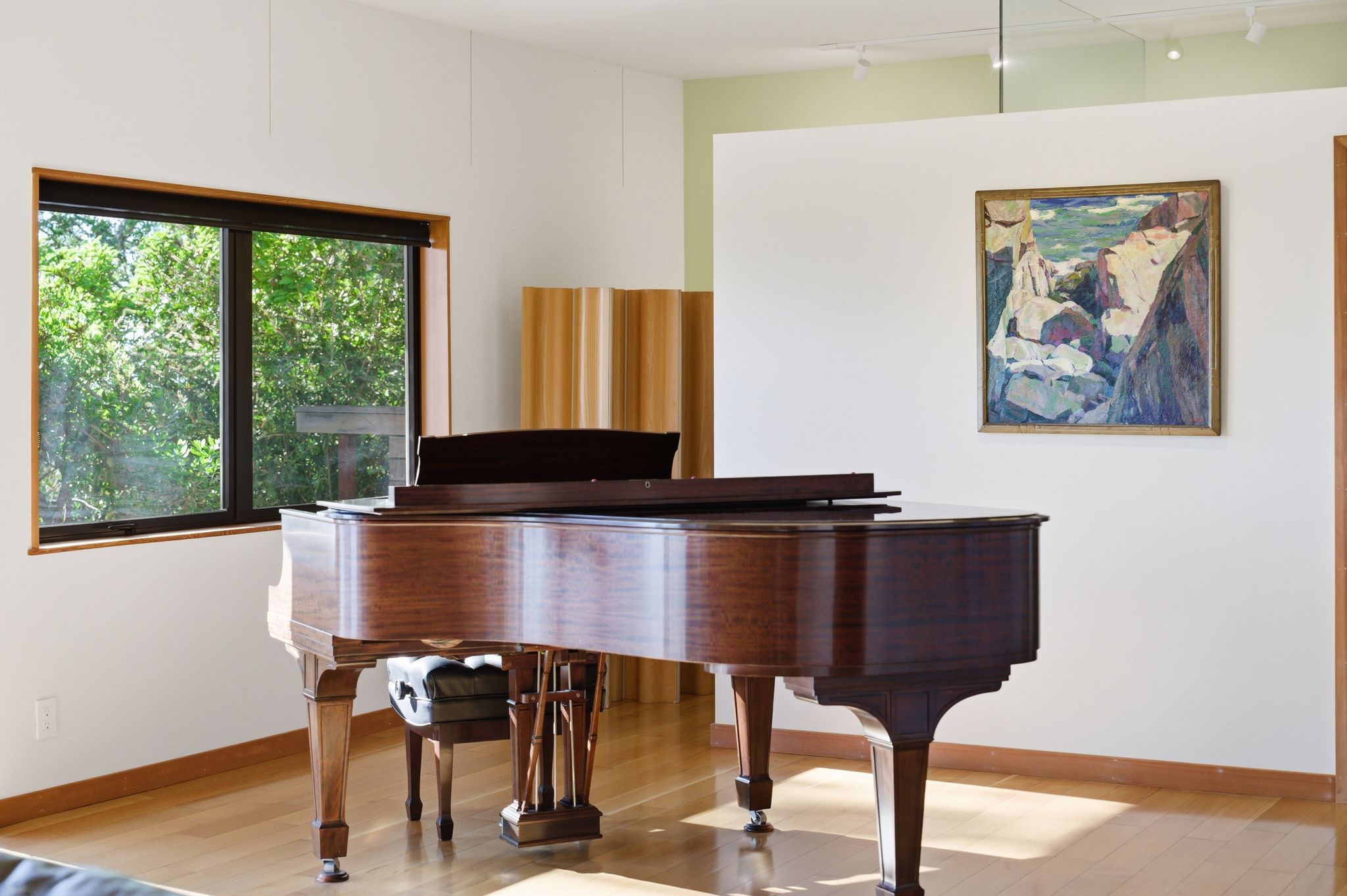 That studio is where the home’s most extraordinary chapter unfolded. Wanda Westberg, one of the Bay Area’s most celebrated fine artists, has painted here for over a decade. Her work is held in private and corporate collections internationally. She and her partner Richard Pettler, a noted attorney and art collector, purchased the home in 2012 and transformed it into something genuinely singular: a living gallery where world-class art was made and displayed in the very space that inspired it. Wanda’s paintings are featured prominently throughout every room, their scale and presence perfectly matched to Hattam’s generous proportions and light-filled interiors.